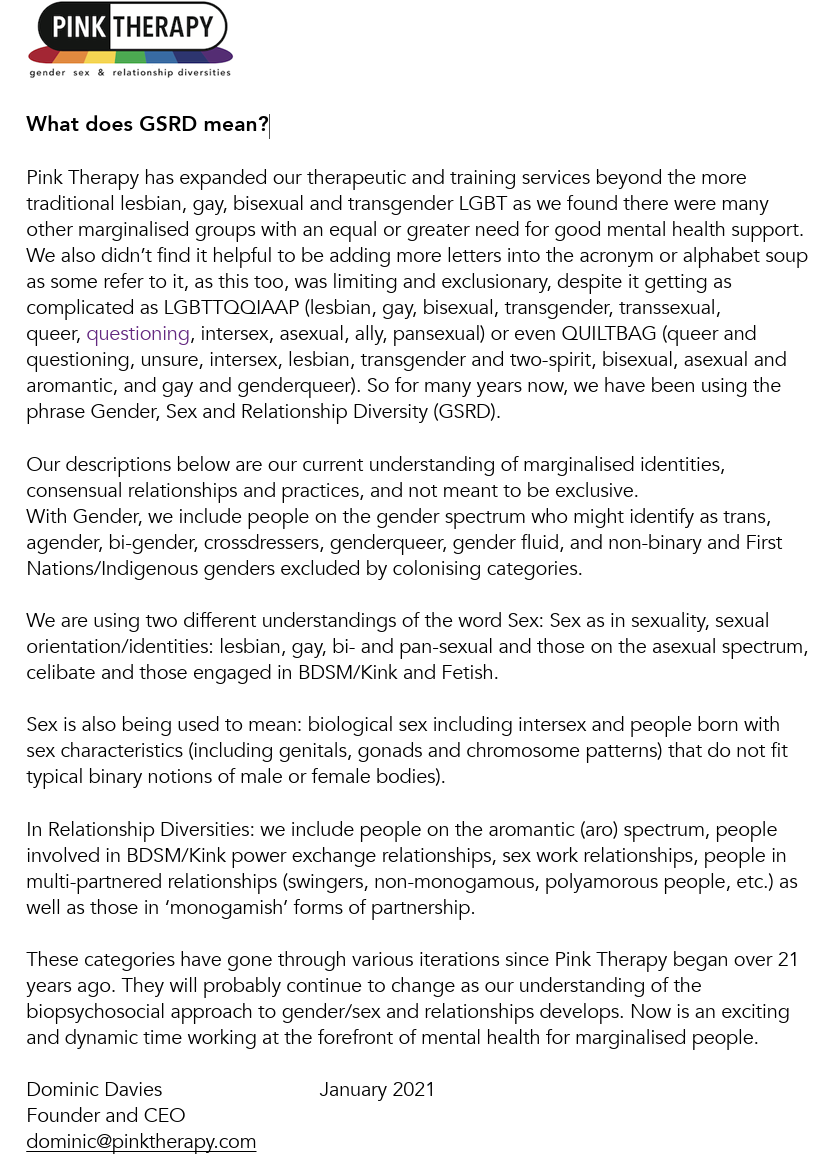 I am Gender Sex and Relationship Diversity affirming in both my values and practice (see Pink Therapy’s definition below). My practice is broader and specialising in trauma skilled creative and somatic work so I haven’t completed specific GSRD postgraduate training. I don’t think it helps to try to be all things to all people and formal training programmes are often more expensive than university tuition. So if things come up as part of our wider work that’s great and we can discuss if I need to refer you on. For folx who are primarily doing work on gender identity or significantly changing relationship diversity dynamics. I can recommend;